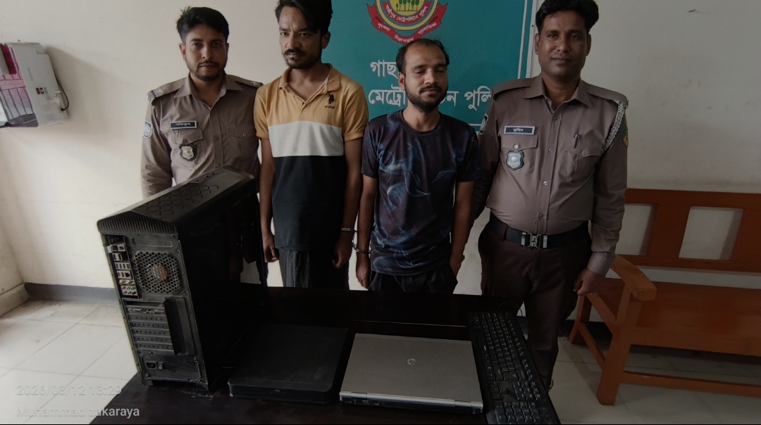 এলাকায় ঝটিকা অভিযান চালায়। আজ ১২ মার্চ ২০২৬ তারিখ রাত ২টার দিকে দসুযুতা মামলার প্রধান দুই কুচক্রী আসামি রাহুল খান (২৫) ও মােঃ শাকিল হােসেনকে (২৮) গ্রেফতার করা হয়। গ্রেফতারের পর তাদের দেওয়া তথ্য অনুযায়ী লুষ্থিত একটি ল্যাপটপ, একটি কম্পিউটারের সিপিইউ, একটি ডিভিআর এবং একটি কিবাের্ড উদ্ধার করা হয়েছে। এছাড়া দস্যুতার সময় ব্যবহৃত একটি ধারালো ছুরা ও একটি পেপার কাটার চাকু জন্দ করা হয়। উদ্ধারকৃত মালামালের আনুমানিক বাজারমূল্য ১ লক্ষ ৬৩ হাজার ২০০ টাকা বলে জানিয়েছে পুলিশ। তদন্তে আরও চাঞ্চল্যকর তথ্য বেরিয়ে এসেছে যে, গ্রেফতারকৃত প্রধান আসামি রাহুল খানের বিরুদ্ধে ইতােমধ্যেই ডাকাতি, ছিনতাই, মাদক, মারামারি এবং পনোগ্রাফি আইনসহ মােট ৭টি মামলা বিজ্ঞ আদালতে বিচারাধীন রয়েছে। সে এলাকায় একজন চিহ্নিত অপরাধী হিসেবে পরিচিত। এই বিশেষ অভিযানে দস্যুতা মামলার ২ জন ছাড়ুাও মাদকের মামলায় ৩ জন এবং বিভিন্ন অপরাধে জড়িত থাকার দায়ে আরও ৪ জনকে গ্রেফতার করা হয়েছে। মােট ৯ জন আসামিকে যথাযথ আইনি প্রত্রিয়ায় আদালতে সােপর্দ করার প্রস্তুতি চলছে। অপরাধ দমনে গাছা থানা পুলিশের এমন তৎপরতা ভবিষ্যতে অপরাধীদের জন্য কঠোর বার্তা হিসেবে কাজ করবে বলে মনে করছেন সংশ্লিষ্টরা। গাজীপুর মেট্রোপলিটন পুলিশের এই সফল অভিযান মূলত অপরাধীদের প্রতি জিরে টলারেন্স নীতিরই প্রতিফলন। গাছা থানা পুলিশের এমন বলিষ্ঠ পদক্ষেপের ফলে সাধারণ ব্যবসায়ীরা নিরাপত্তা বােধ করছেন এবং এলাকায় অপরাধ প্রবণতা ভ্রাসে এটি দীর্থায়ী ভূমিকা রাখবে।